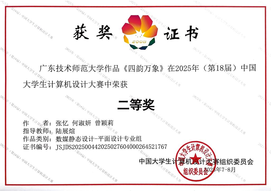 7月22日至26日,第18届中国大学生计算机设计大赛全国总决赛在南京大学成功举办,在南京南决赛区的“数媒静态设计”——平面设计专业组中,由美术学院陆展煊博士指导2023级视觉传达设计专业学生张忆、何淑妍、曾颖莉的作品《四韵万象》荣获国家级二等奖,充分展现了我校学子扎实的专业功底与出色的创新能力。